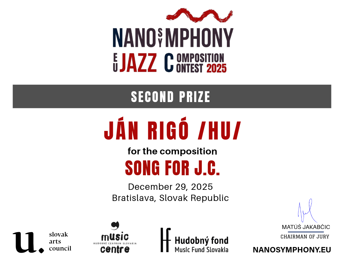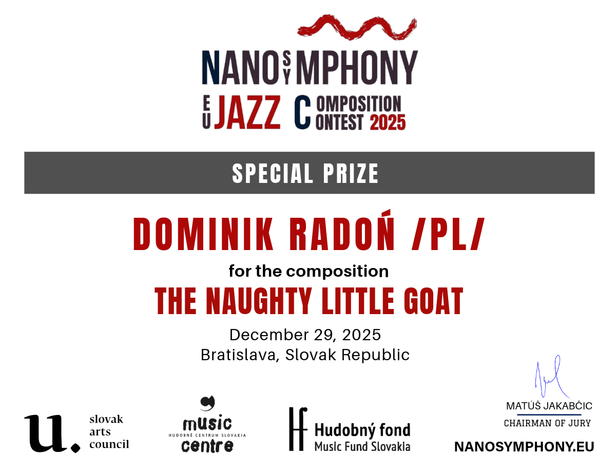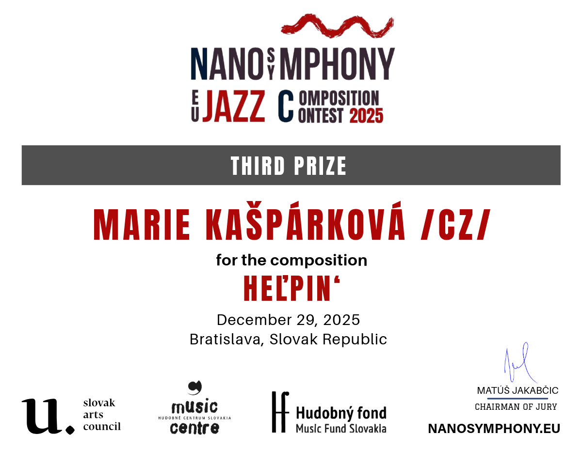 The contest was organized by Nanosymphony, o.z., in cooperation with its partners — Slovak Arts Council, Music Fund Slovakia, and The Music Centre Slovakia — whose support was instrumental in fostering young talent, supporting artistic excellence, and strengthening the international visibility of contemporary European jazz composition.